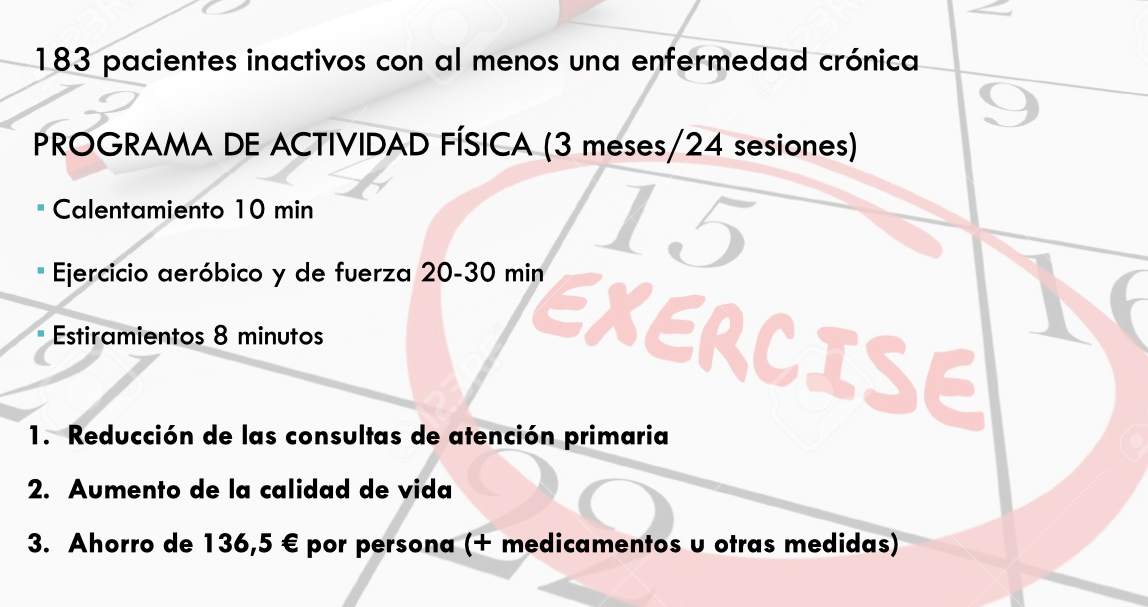Los siguientes datos son un resumen de los resultados obtenidos en un estudio científico realizado en España, donde 183 pacientes, sedentarios, se sometieron a un programa de actividad física sencillo y que resultó ser eficaz para reducir las consultas en atención primaria, mejorar la calidad de vida de las personas (más de 12 meses) y ahorrar costes sanitarios.